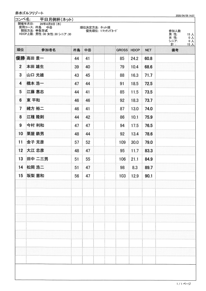4月 平日月例杯(ネット)